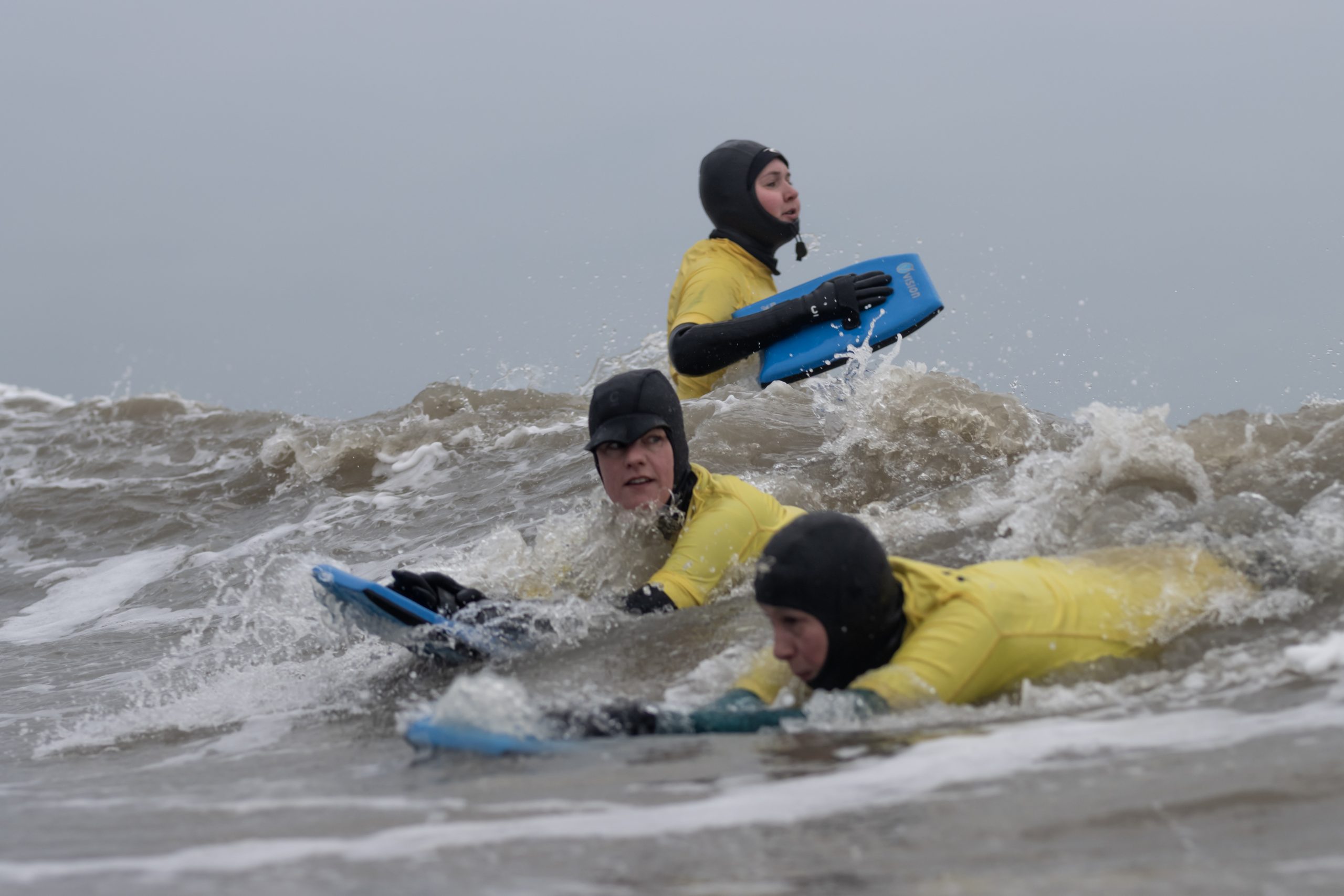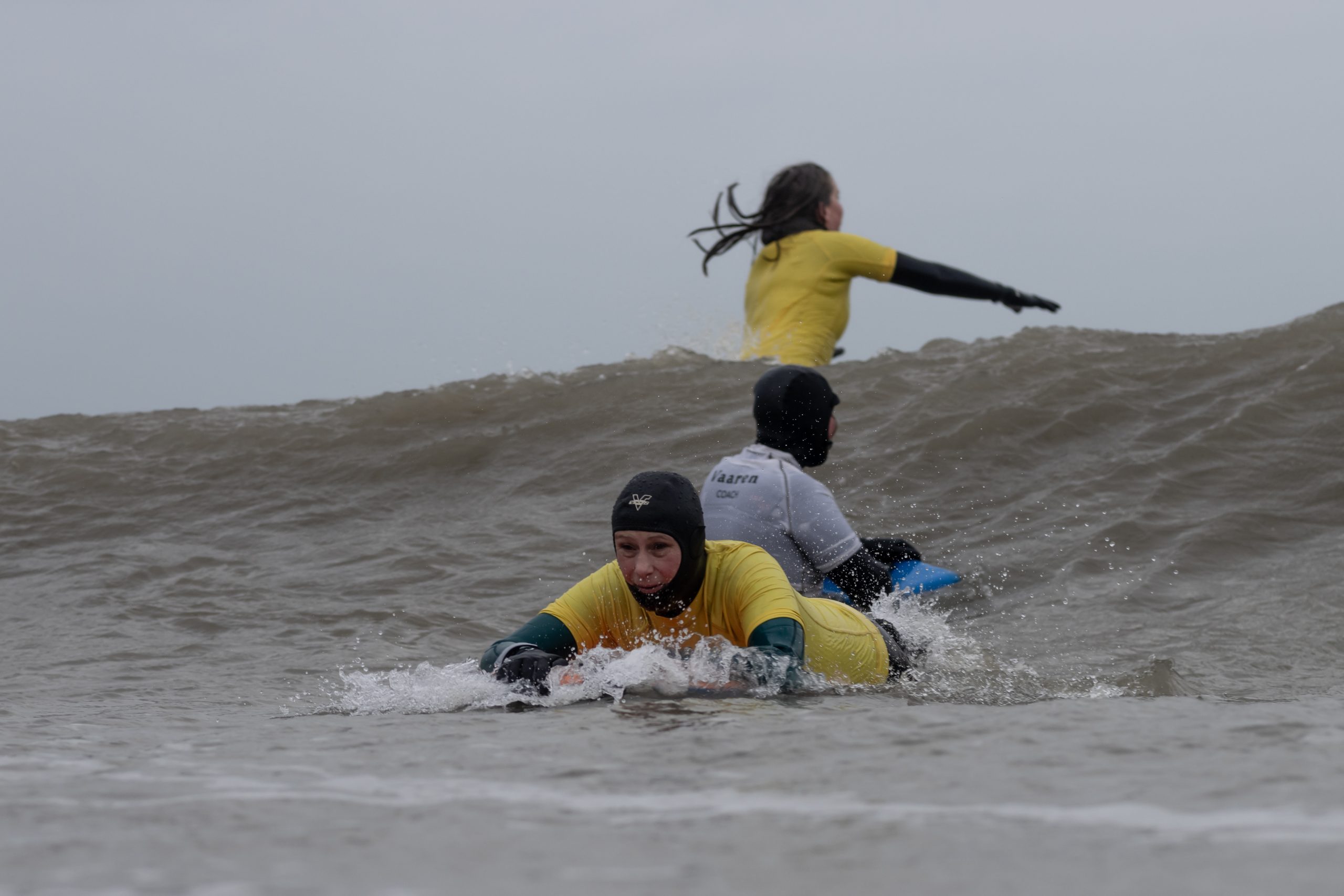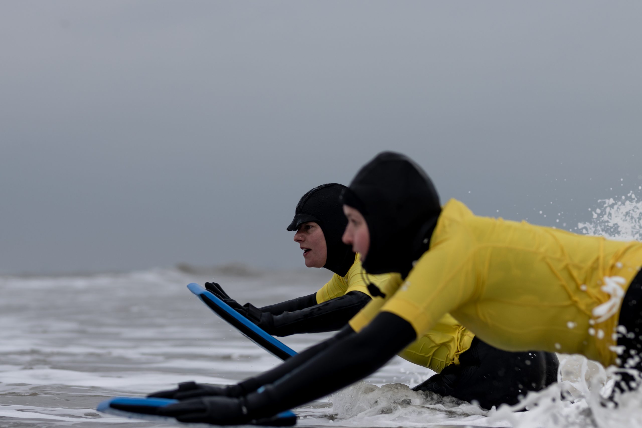 Voor sommige deelnemers is de kou in eerste instantie een drempel, maar je hoeft geen bikkel te zijn om met een goed wetsuit de zee in te stappen. Dankzij de surfmaterialen van Skiffa Surfclub is ‘kâuw leien’ verleden tijd. Thanks daarvoor!